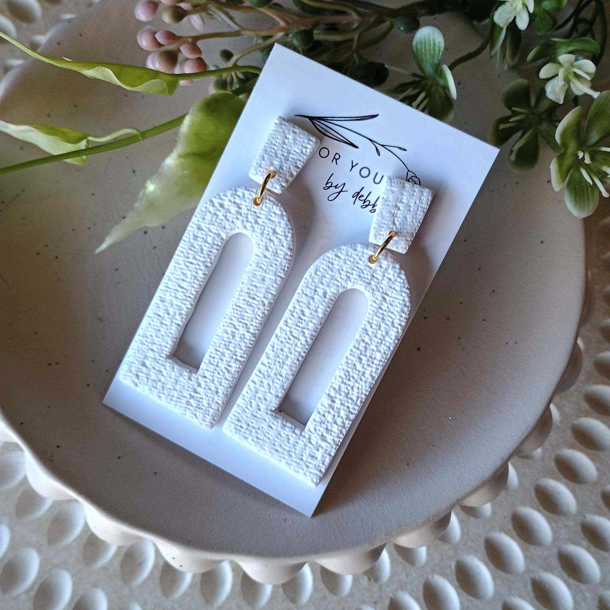 Matte white polymer clay with fabric print texture,. Lightweight and all day comfortable.