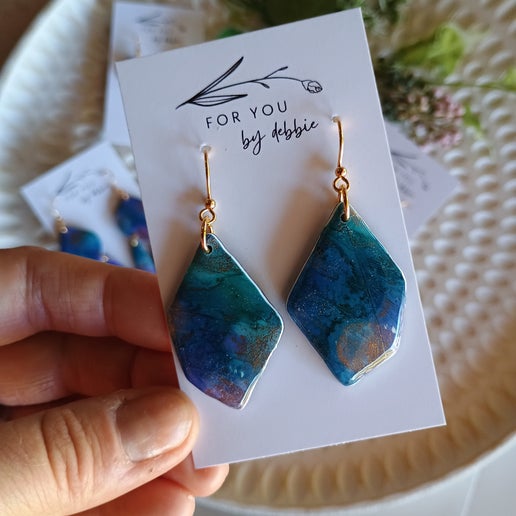 galactic combination of Blues, purple, teal alcohol ink on polymer clay, gold foil accents and UV resin shine.