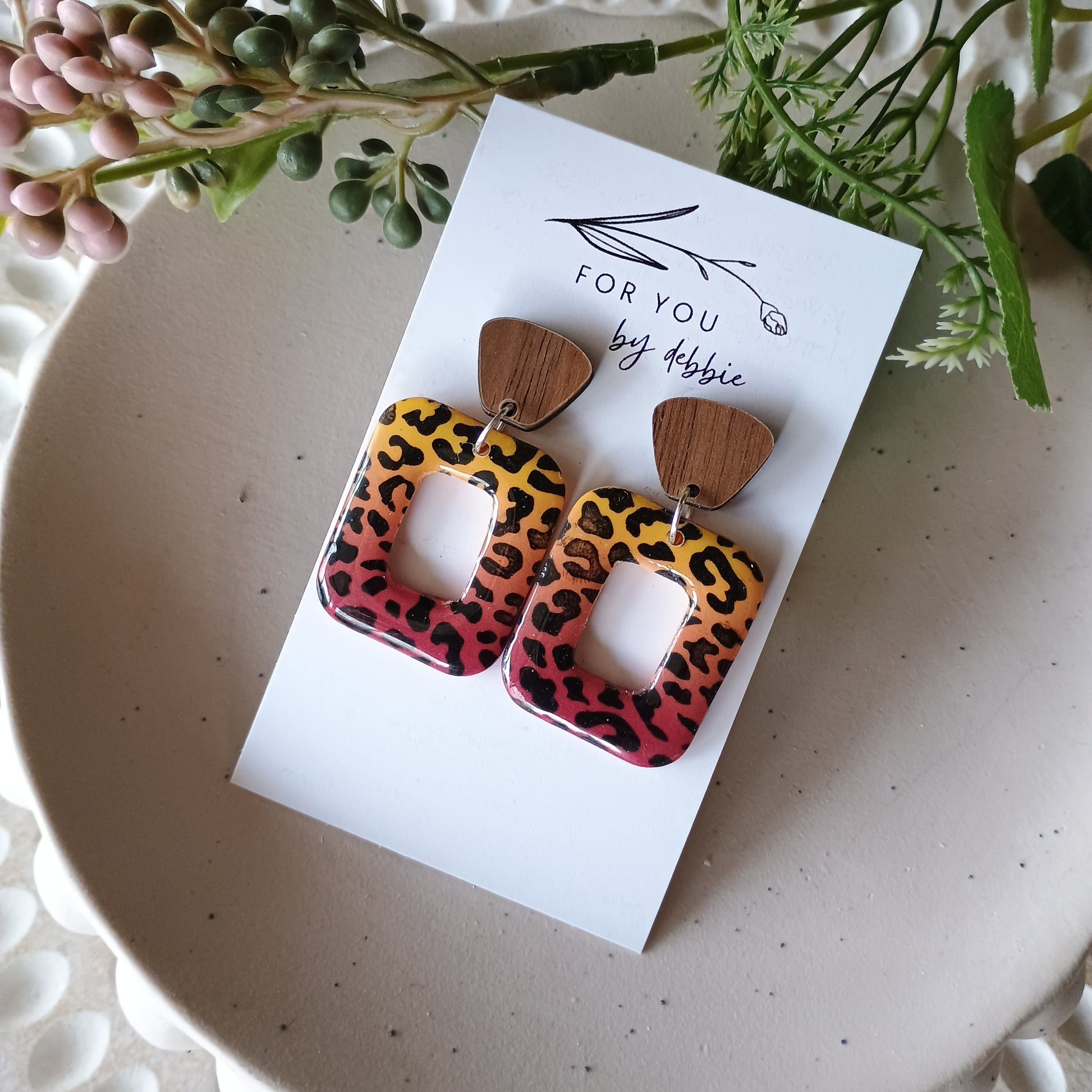 Red to yellow blended polymer clay, painted leopard print, UV resin shiny finish, wood stud top