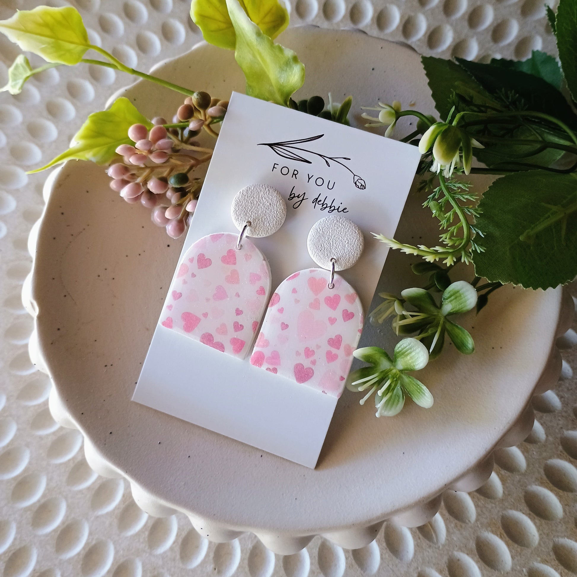 white sandpaper texture polymer clay top, ended embedded stud posts, heart print and uv resin.