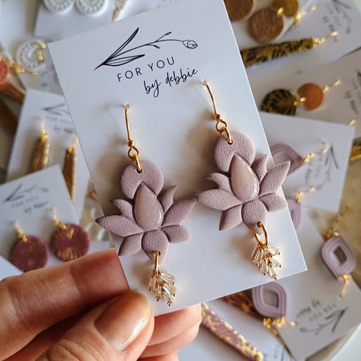 taupe embossed lotus shape polymer clay, uv resin accent and with CZ charms.