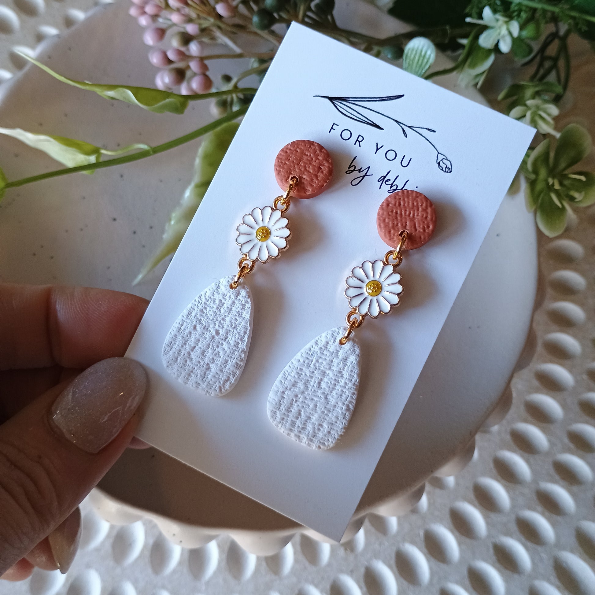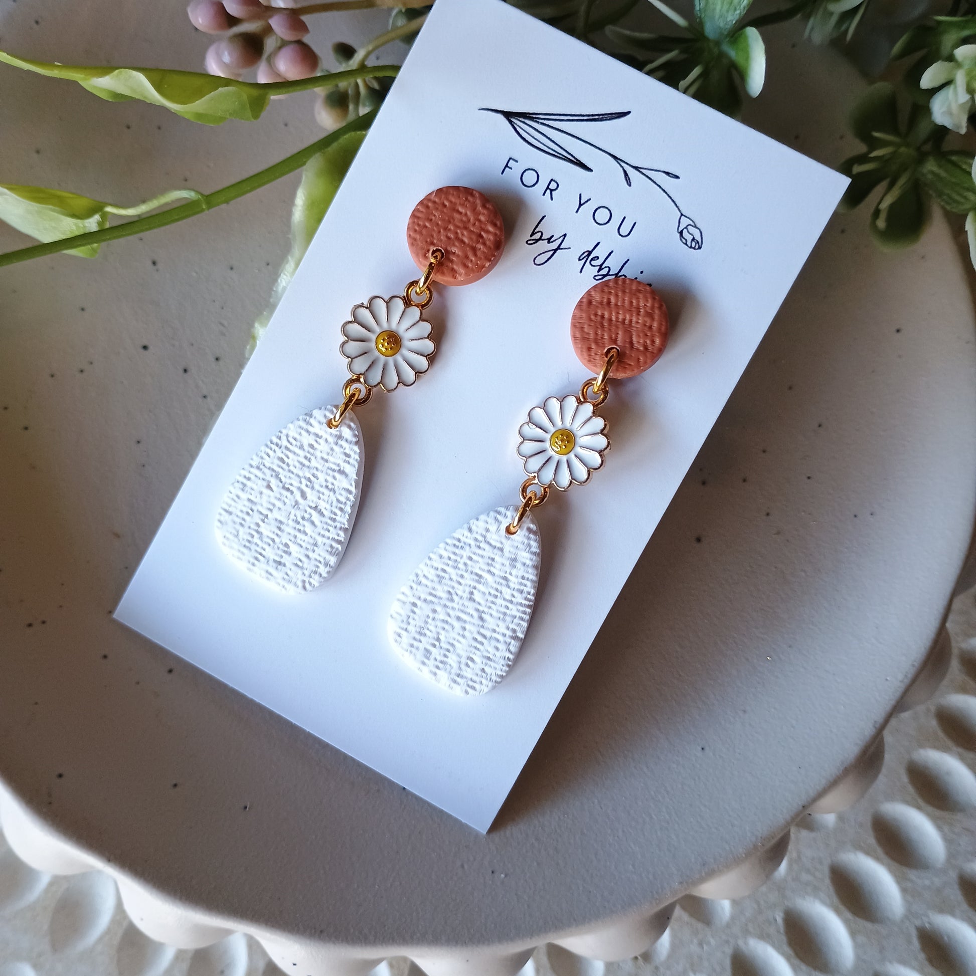 Matte white and brown polymer clay with fabric print texture, gold tone white flower charm.