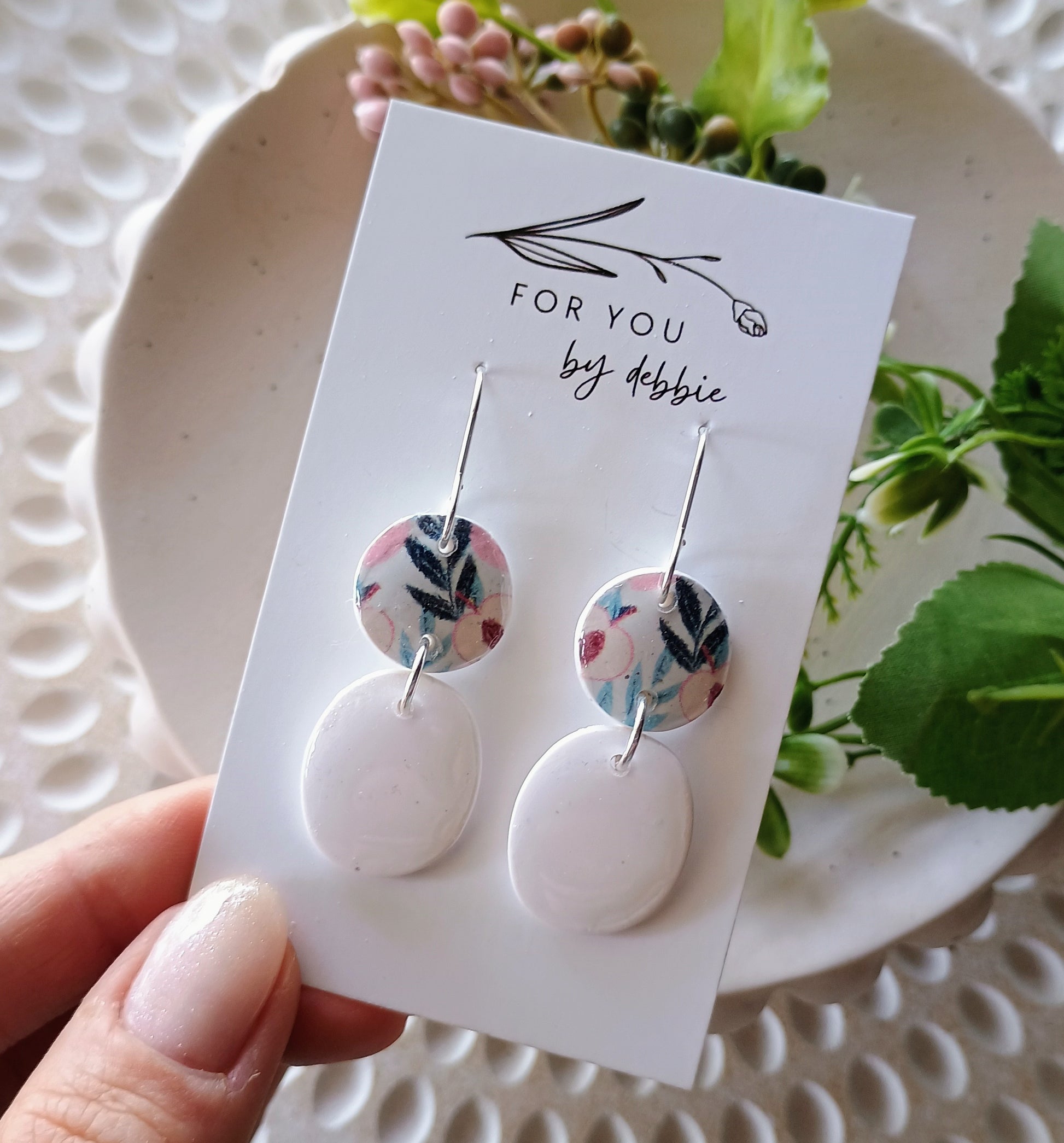 white polymer clay with a peach tree paper print and uv resin,.