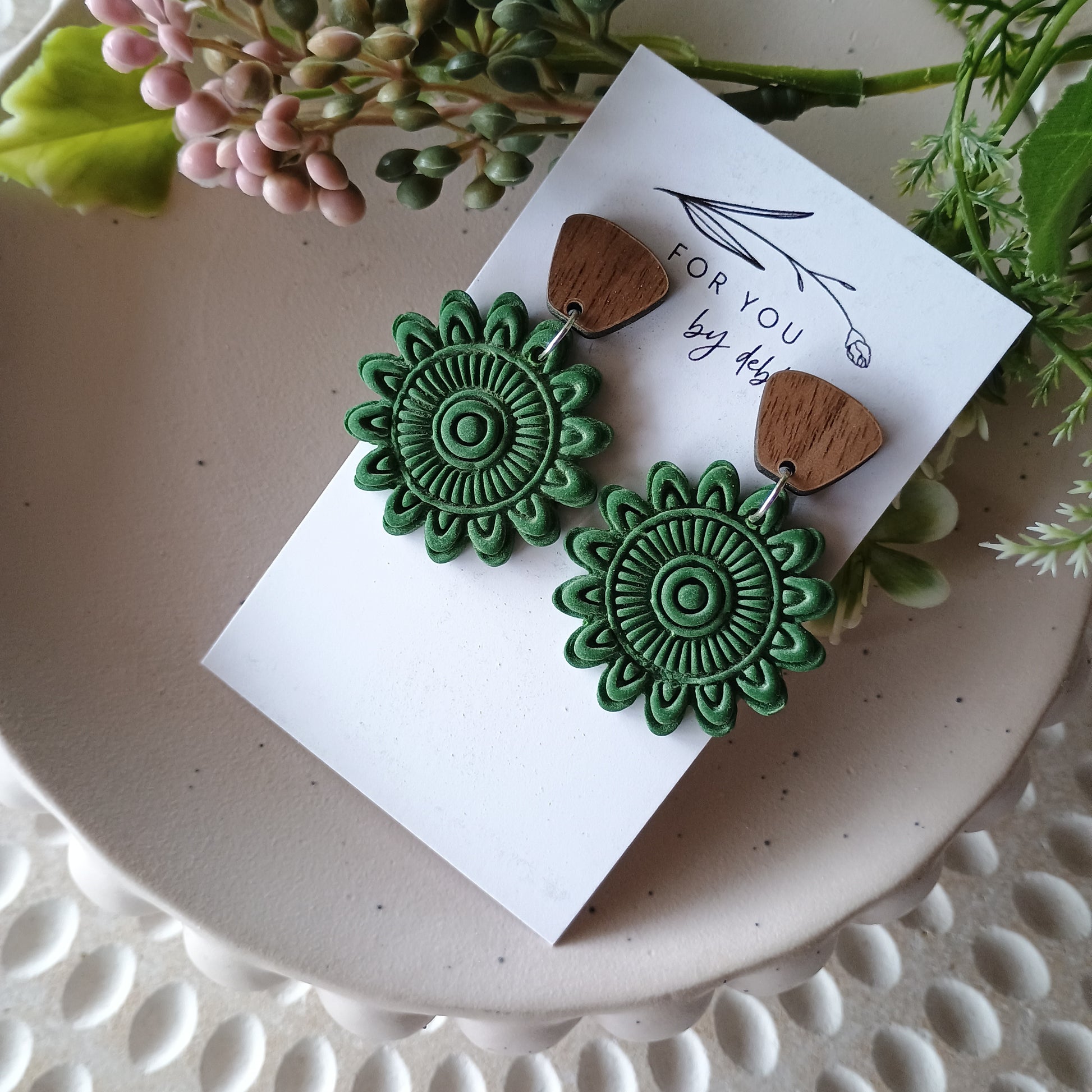 polymer clay embossed mandala flower shape with wood stud top.
