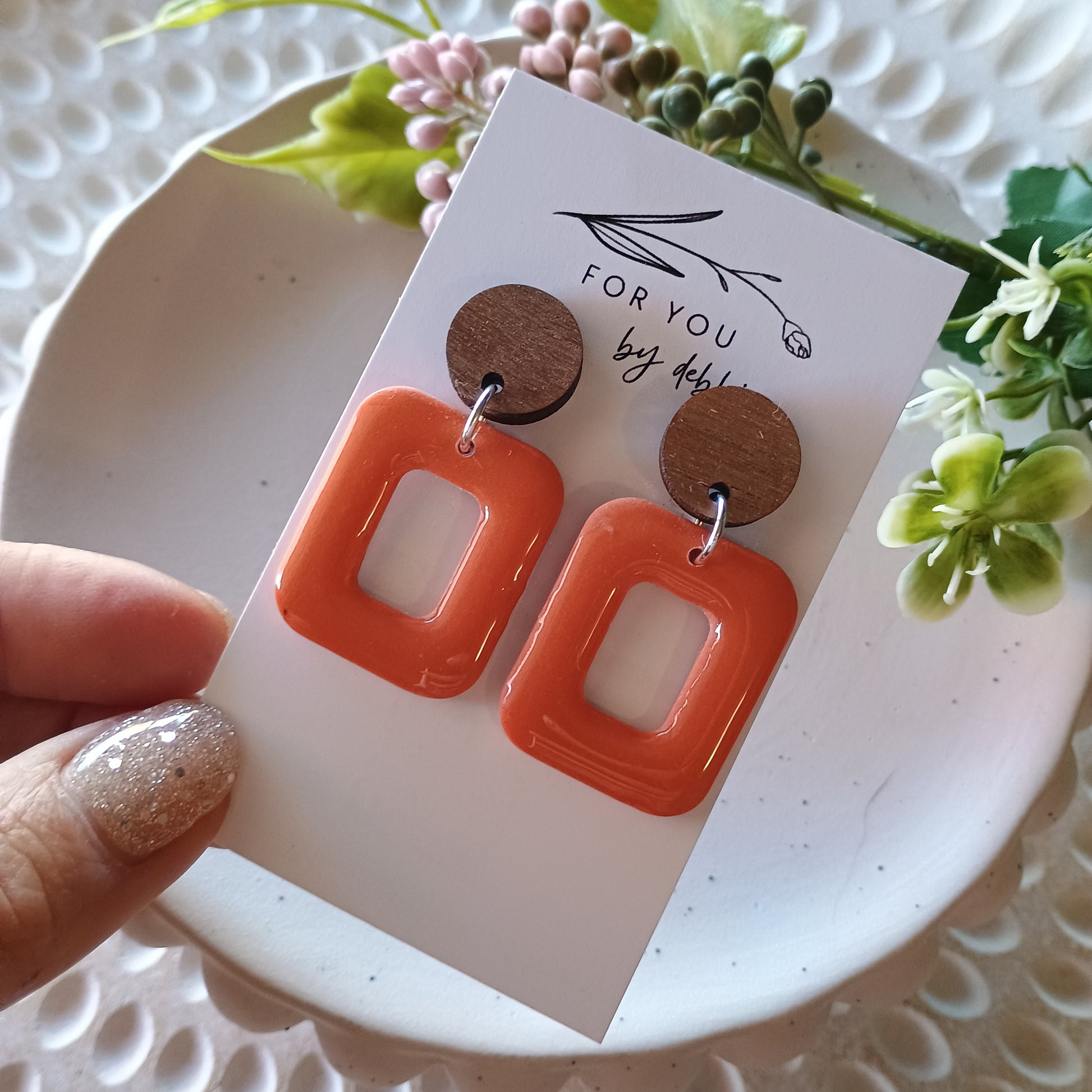 Brown /orange polymer clay, UV resin shiny finish, wood stud top