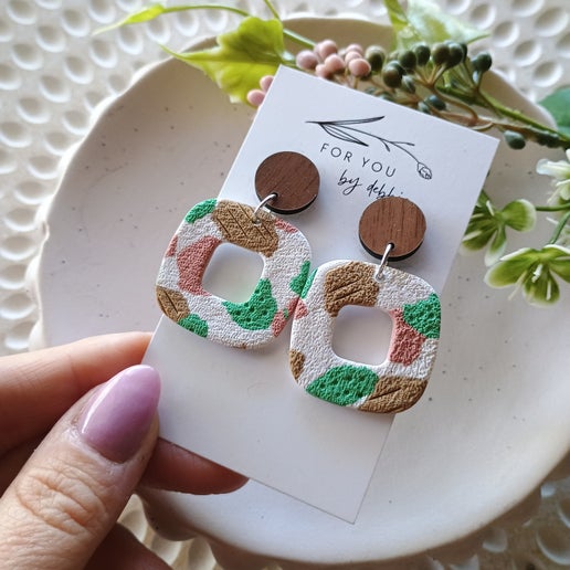 soft neutral shades of polymer clay in textured matte finish, dark wood stud top.